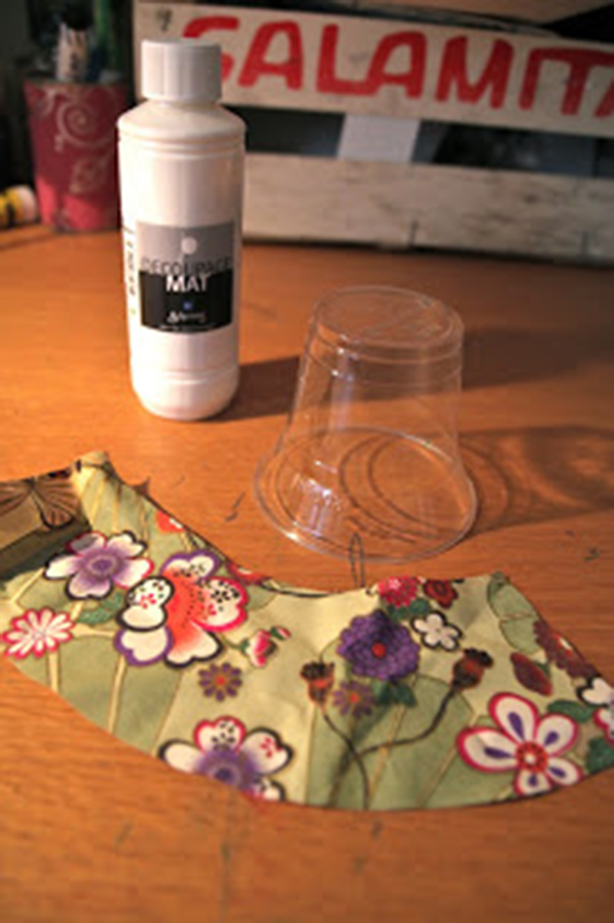 Una vez recortadas las telas procedemos a pegarlas a nuestro vaso.